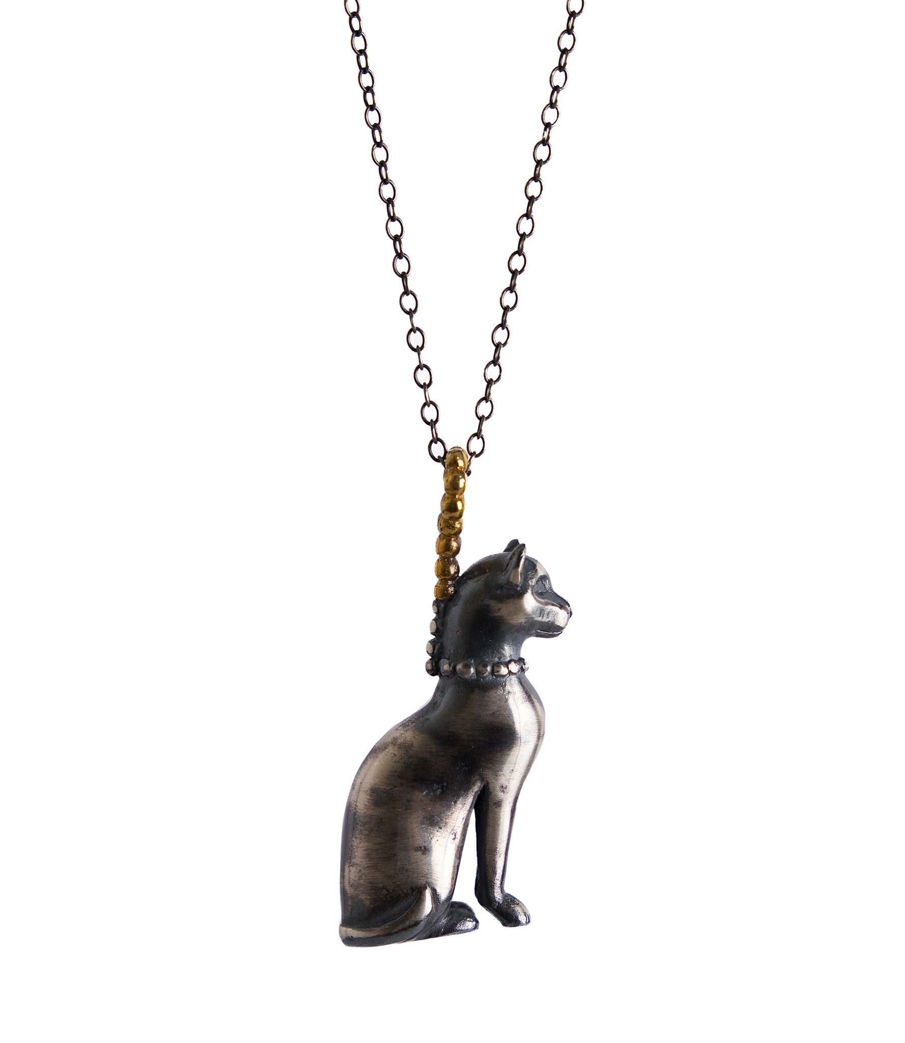 Cast in sterling silver, this 1.8" pendant hangs from a either a 14k gold or bronze leash. Fierce and regal, she is strung on a 24” oxidized sterling silver chain.