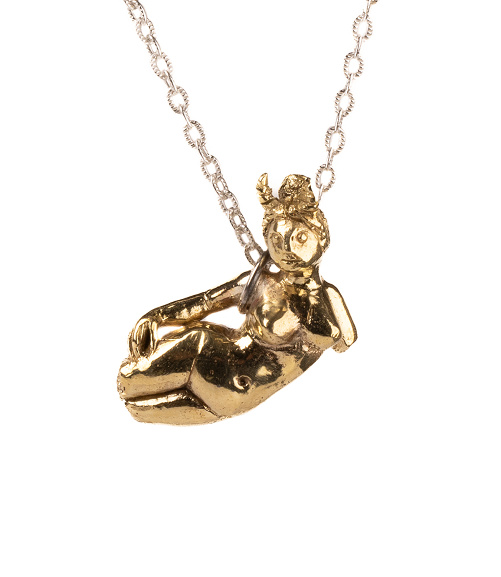 Available in oxidized sterling silver with a 14k gold arm band, bronze with a silver band or solid 14k gold, she hangs from a 20" chain ready to face the world with you.
